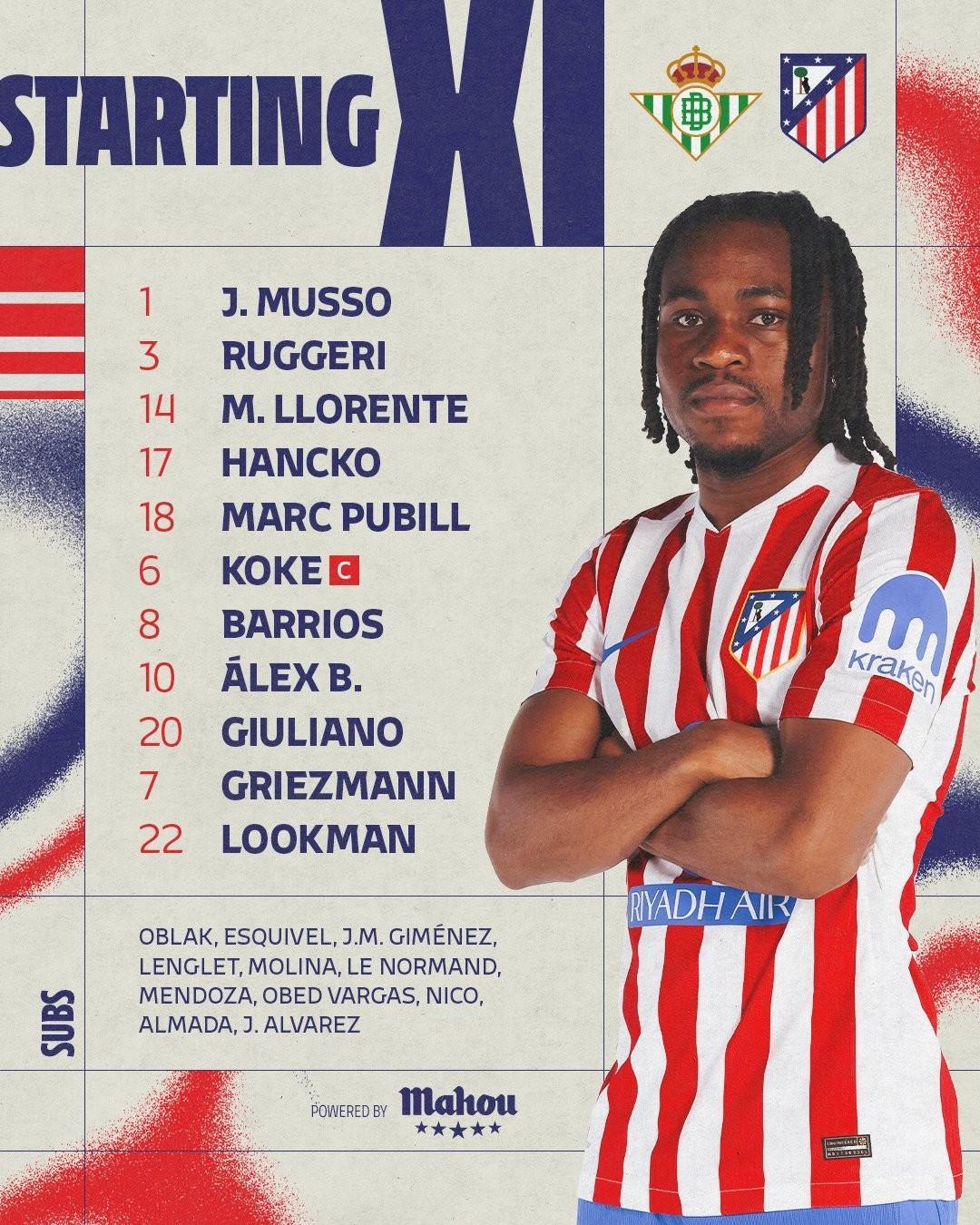 马竞首发:1-穆索、14-马科斯-略伦特、18-普维尔、17-汉茨科、3-鲁杰里、20-小西蒙尼、8-巴里奥斯、6-科克、10-巴埃纳、7-格列兹曼、22-卢克曼